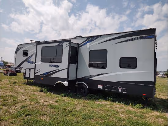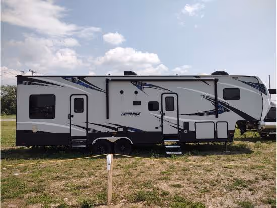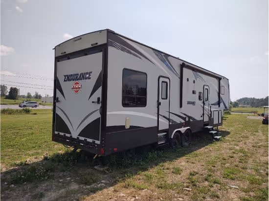 The 2017 Endurance by Dutchman is a fifth-wheel toy hauler for up to 6 people, featuring a master bedroom, full bathroom, slide-out, and a kitchen with essential appliances. It includes a 4-way reclining couch and an LED TV, plus ample storage and a pull-down rear screen door, perfect for your next adventure.