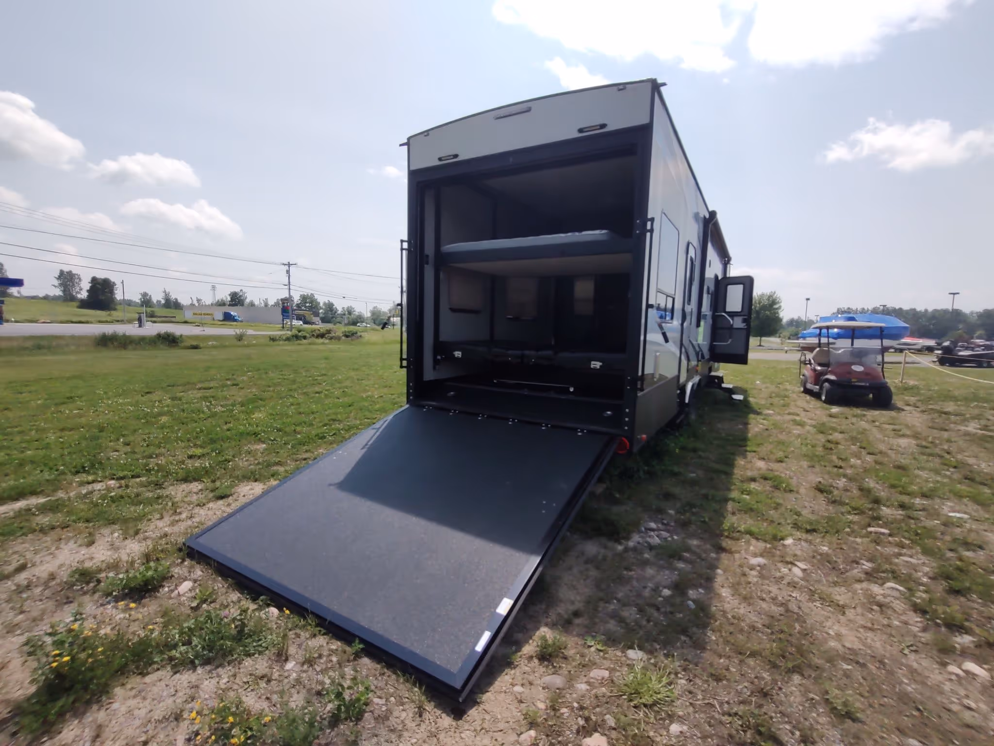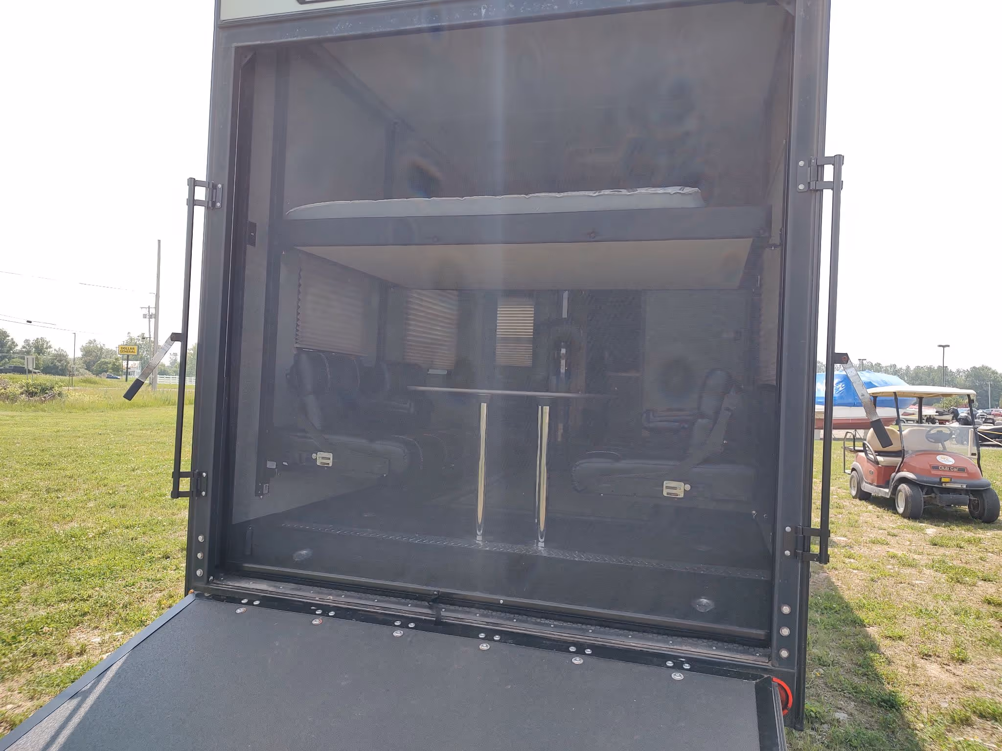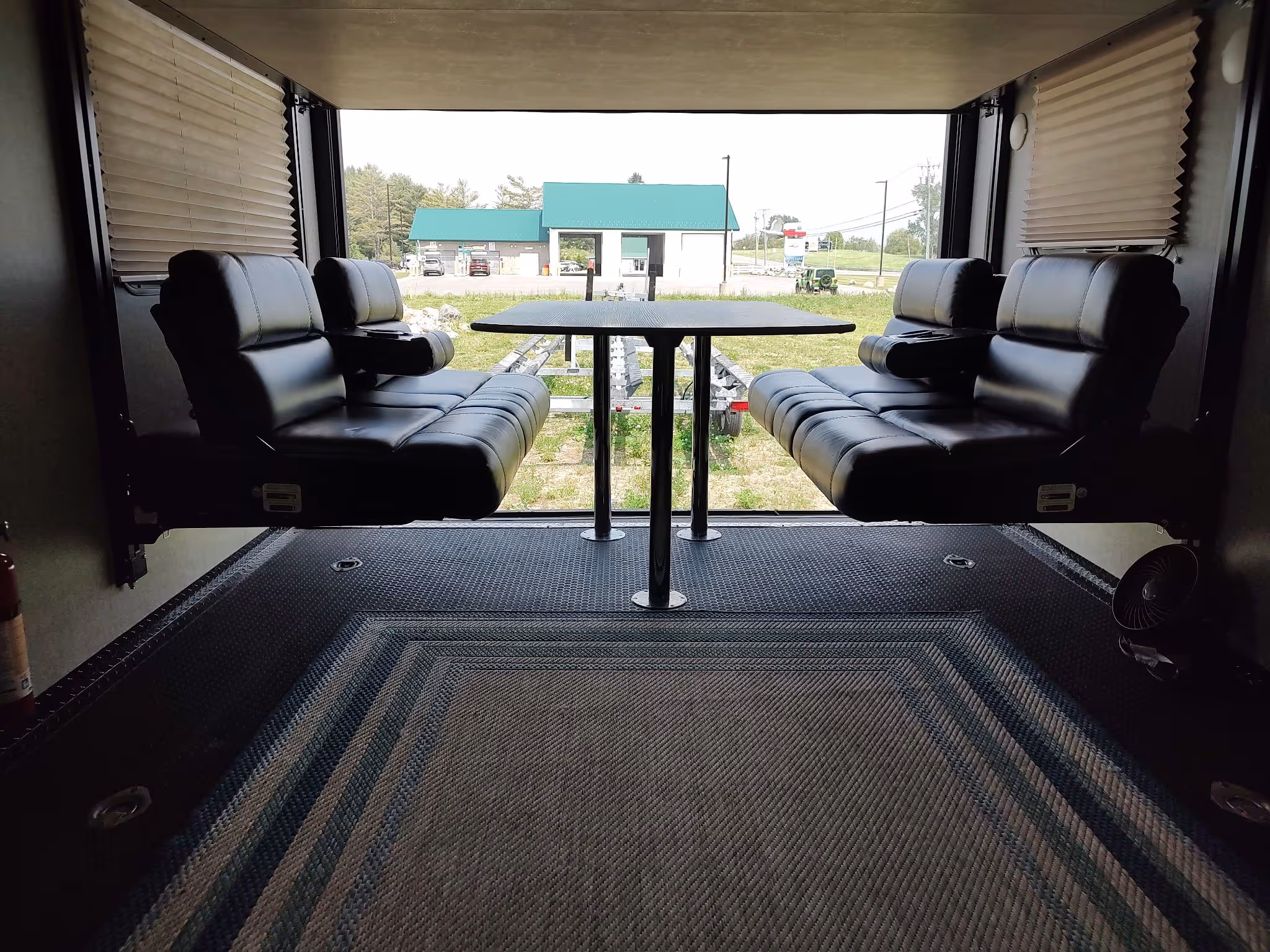 - 1500-lb. D‑rings in the garage, folding tables, and pull‑down screen in the cargo area