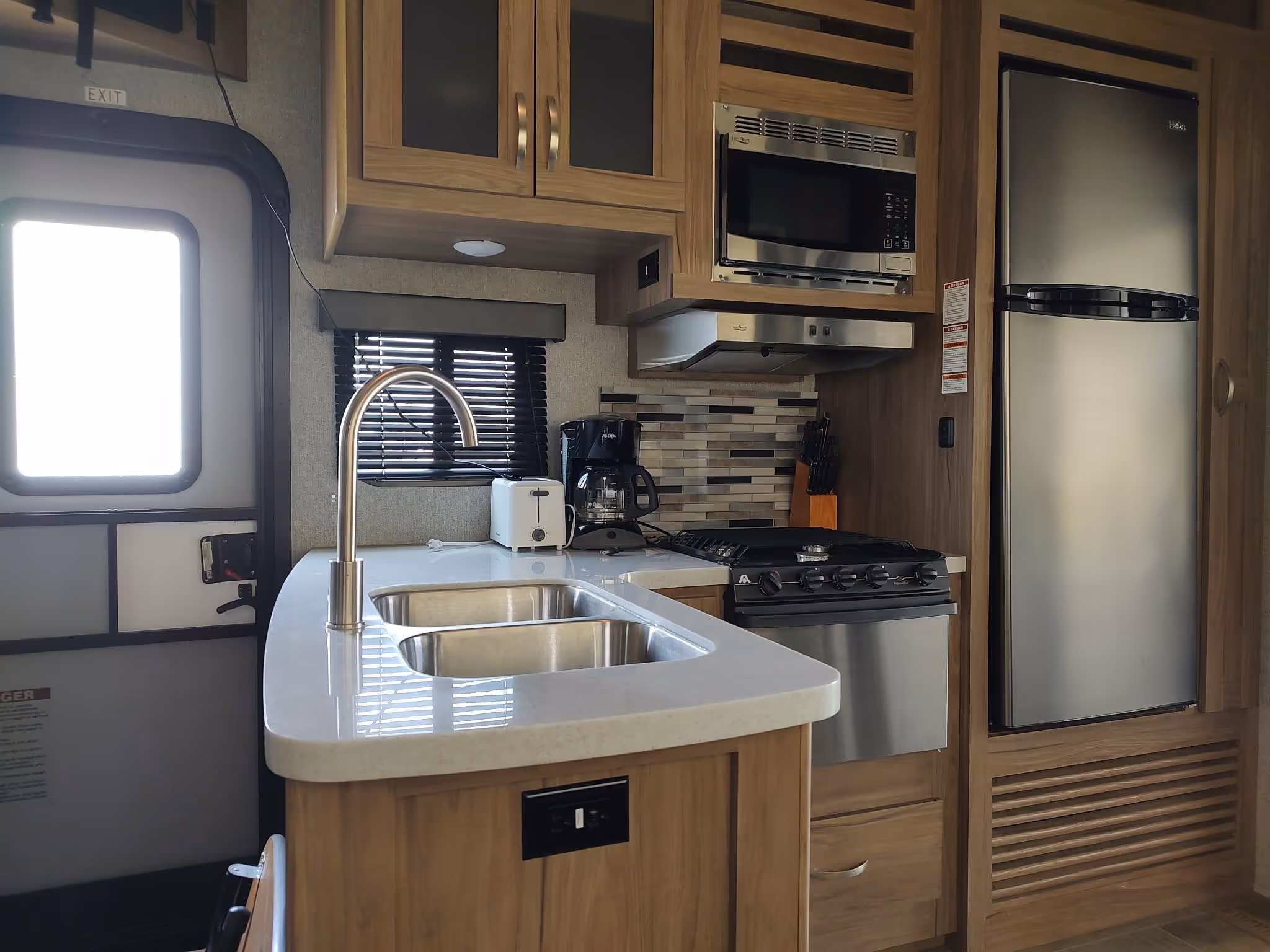- Solid-surface countertops, stainless steel sink, and high-rise kitchen faucet