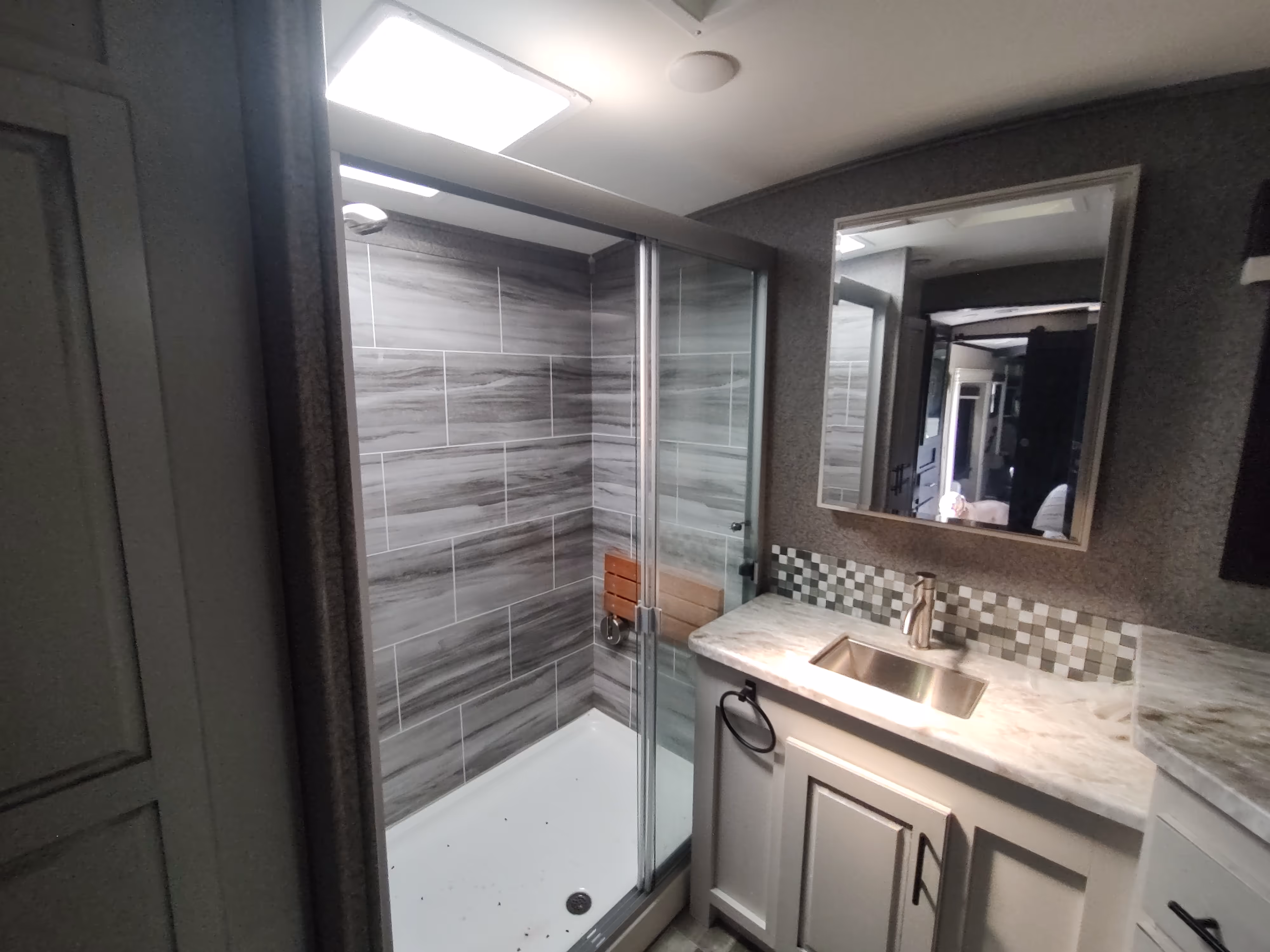- Glass-door shower with teak seat