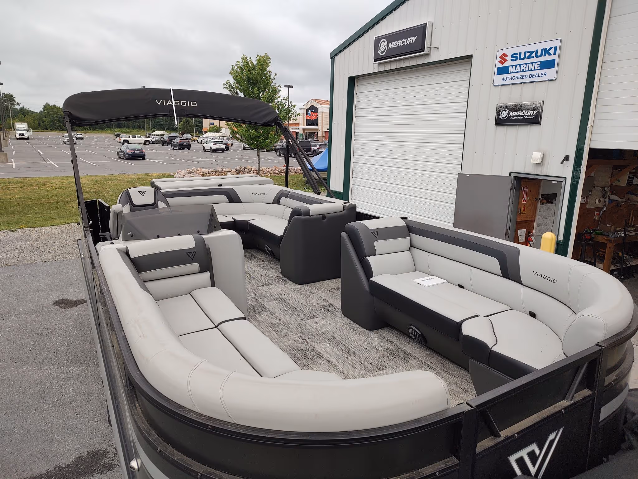 Embark on your aquatic adventures with this brand-new 22' Viaggio Lago U Tri-Toon! Fresh off the production line, this sleek vessel boasts a stylish black, black, and gray exterior that's sure to catch eyes on the water. Powered by a gas-powered outboard Mercury 115EXLPT CT motor, it offers a perfect balance of performance and fuel efficiency. Whether you're cruising with family or entertaining friends, its spacious layout and comfortable seating ensure everyone enjoys the ride. Plus, with the included matching trailer, transporting this beauty to your favorite waterways is a breeze. Don't miss out on the opportunity to own this fantastic vessel and start creating unforgettable memories on the water! Buy now and receive Free Winterization, shrinkwrapping and outdoor cold storage.